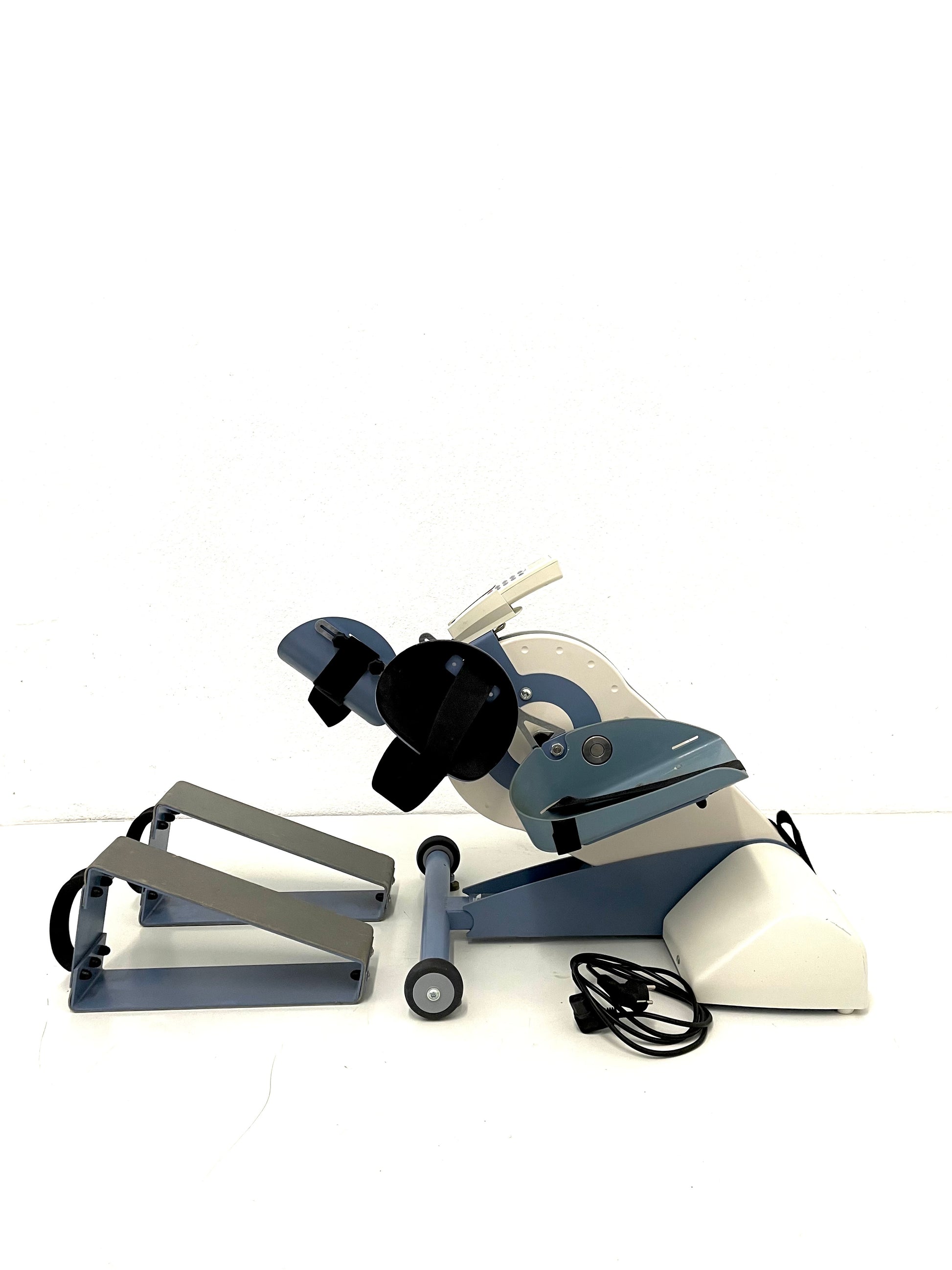 Fremdkraftbetriebener Beintrainer zur Anwendung sitzend aus einem Stuhl oder Rollstuhl heraus, mit Fußschalen und Schnellspanner zur Fixierung. Steuerung der Gerätefunktionen durch das Display. Für Transportzwecke ist das Produkt mit Laufrollen ausgestattet.
